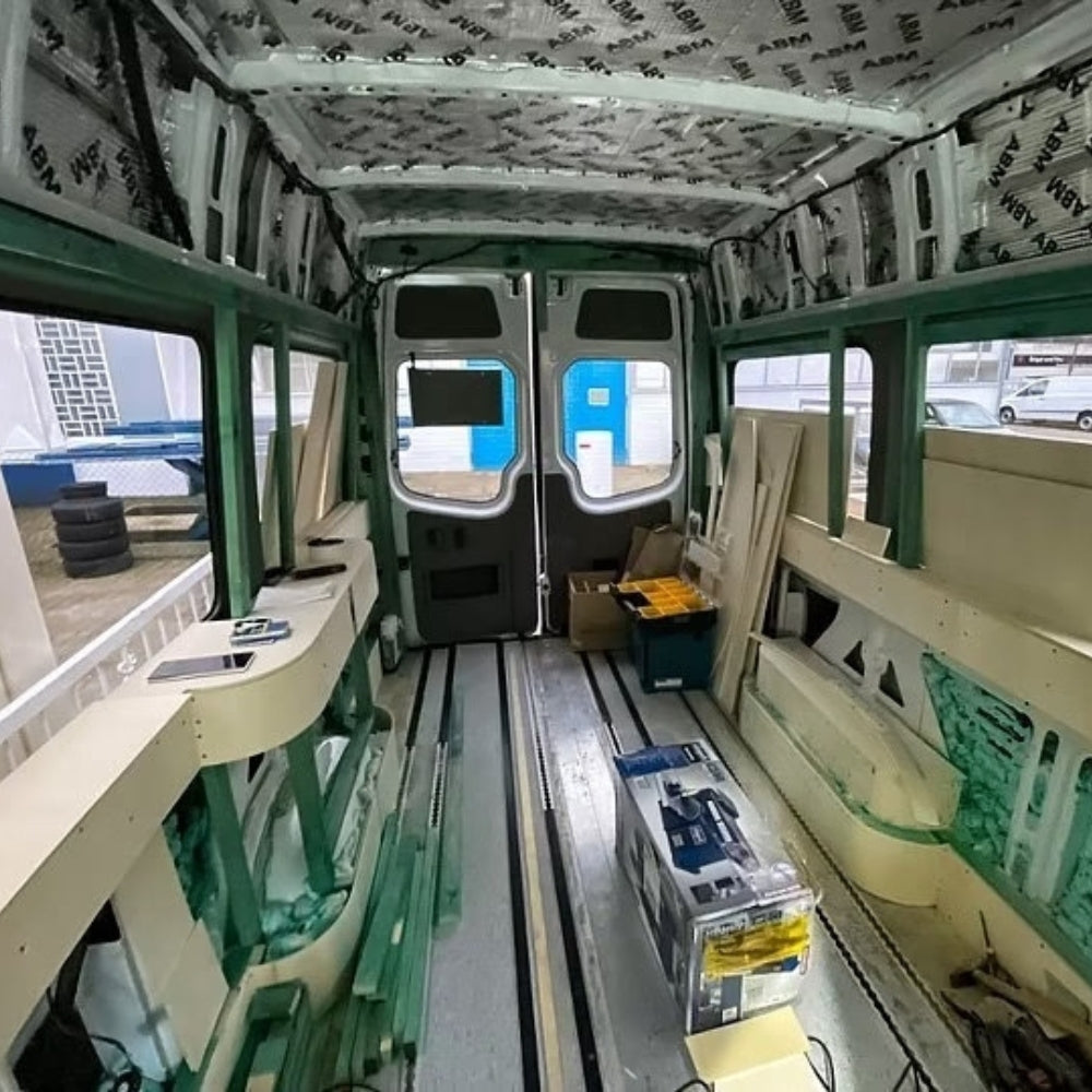 Uns genügten 4 m² Antidröhnmatten. Diese haben wir an den Seitenwänden, der Schiebetür, den hinteren Türen, den Radkästen und der Decke unseres Vans befestigt.